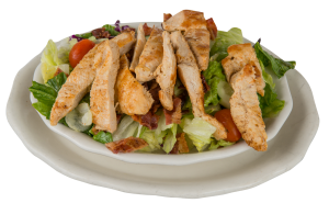 grilled chicken breast on tossed salad with tomatoes, cucumber and chopped bacon